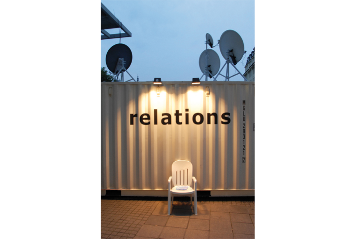 Stromkabel zum Foyer des Veranstaltungshauses versorgten den Container mit Elektrizität und wiesen den Passanten darüber hinaus den Weg zu der von beier+wellach gestalteten „relations-Lounge“. Dort vermittelten Mediatools in der Gesamtschau ein Portrait der verschiedenen Kunst- und Kulturszenen der Länder: In den Videoportraits „Gesichter Europas“ der Journalistin Sibylle Dahrendorf erzählen zehn Künstler und Wissenschaftler ihre ganz persönliche relations Geschichte. An Audiostationen konnten zudem die vom Stadtsoziologen und Publizisten Klaus Ronneberger zusammengestellte sozial- und kulturwissenschaftliche Informationen aus dem relations-Buch Sprung in die Stadt zu den Ländern Moldau, Bulgarien, Kosovo (Serbien Montenegro), Bosnien und Herzegowina, Kroatien, Slowenien und Polen abgerufen werden. |