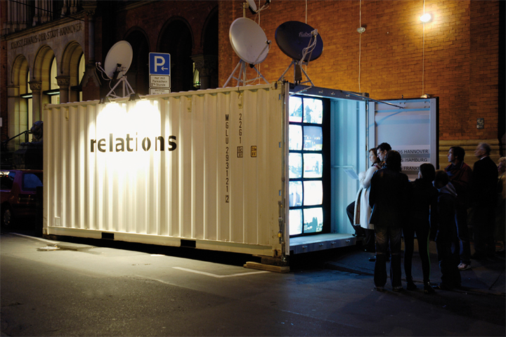 Zum Abschluss der vierjährigen vom Kulturstiftungsprojekt relations initiierten intensiven Zusammenarbeit zwischen Künstlern, Theoretikern, Publizisten und Kuratoren aus dem östlichen Europa mit ihren deutschen Kollegen hat relations gemeinsam mit beier+wellach die „Bilder des Ostens – relations docking tour“ entwickelt. Das interdisziplinäre Veranstaltungsprogramm am schauspielhannover, dem Deutschen Schauspielhaus in Hamburg und dem Schauspiel Frankfurt ließ Kunst, Text und Musik aus dem östlichen Europa auf deutsche Realitäten treffen. Als Störfaktor im öffentlichen Raum dockte ein 6 Meter langer Überseecontainer einen Tag vor den Veranstaltungen an die Kulturhäuser an. Bestückt mit Multimediatechnik, Satellitenantennen, übertrug der Container über eine Medienwand mit 15 Monitoren „Realitäten“ direkt aus dem Alltag in Chisinâu, Sofia, Pristina, Sarajevo, Warschau, Zagreb und Ljubljana in den öffentlichen Raum. Der Container sendete das Tagesprogramm der jeweiligen Nationalsender, die Nachrichtensendungen, das Kinderprogramm, die Werbeblöcke. Unterbrochen wurden die nationalen Medienoberflächen durch Steady-Cam-Alltagsbeobachtungen von charakteristischen Plätzen der jeweiligen Stadt, produziert von Künstlern aus den relations-Projekten und montiert und arrangiert von beier+wellach. Dokumentarische Echtzeit-Bilder und Medienphantasien koexistierten und verschwanden wieder, eines nach dem anderen. Auf diese Weise erhielten Besucher und Passanten in aller Unaufgeregtheit einen Einblick in die „national-typischen“ Oberflächen der sieben Städte.
